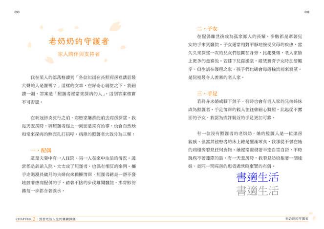 與生老病「師」相伴的日常、預習老後人生的關鍵課題、居家照護與長照機構的抉擇,提供具體的省思與方法,助益每一位走在照護路上的你。