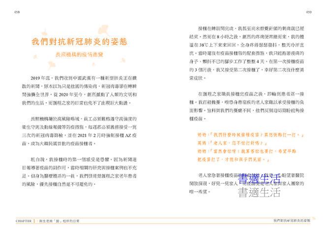 本書三個單元:與生老病「師」相伴的日常、預習老後人生的關鍵課題、居家照護與長照機構的抉擇。提及目前及未來「長照」所面臨的現實面,包含:醫療照護、患者身心、照護者及為人子女的心情與困境,進而促使大家思考未來個體、父母年老的議題,或更具體的規章制度,非常有助益。