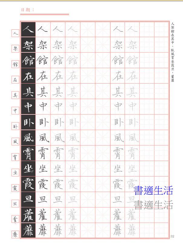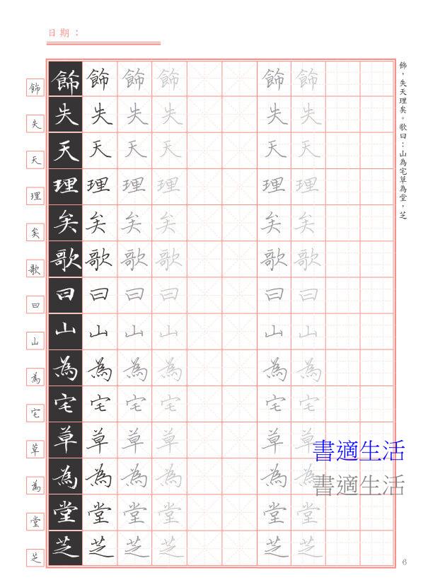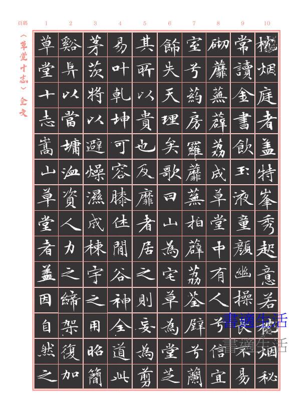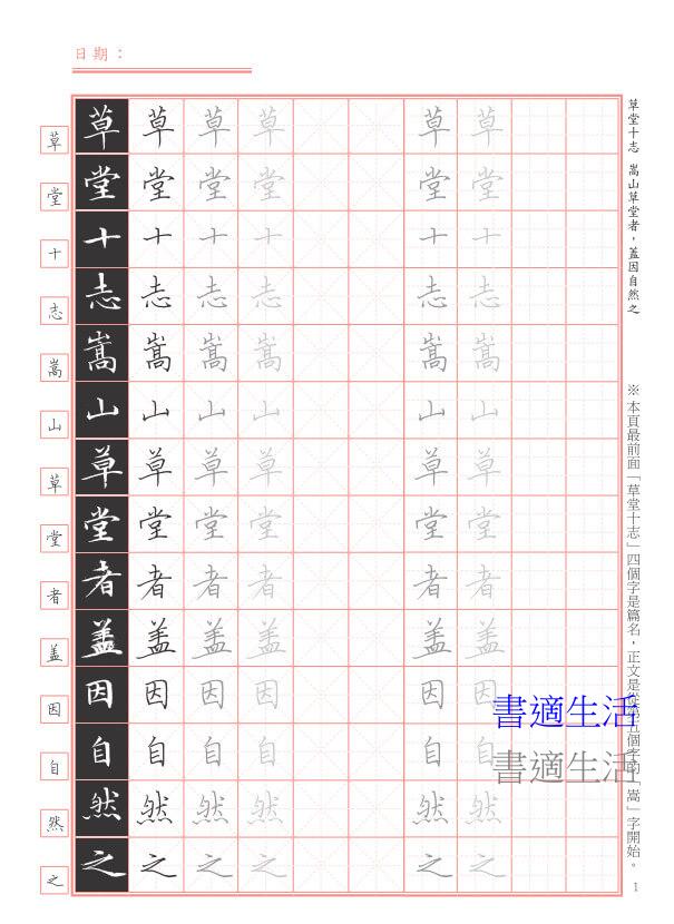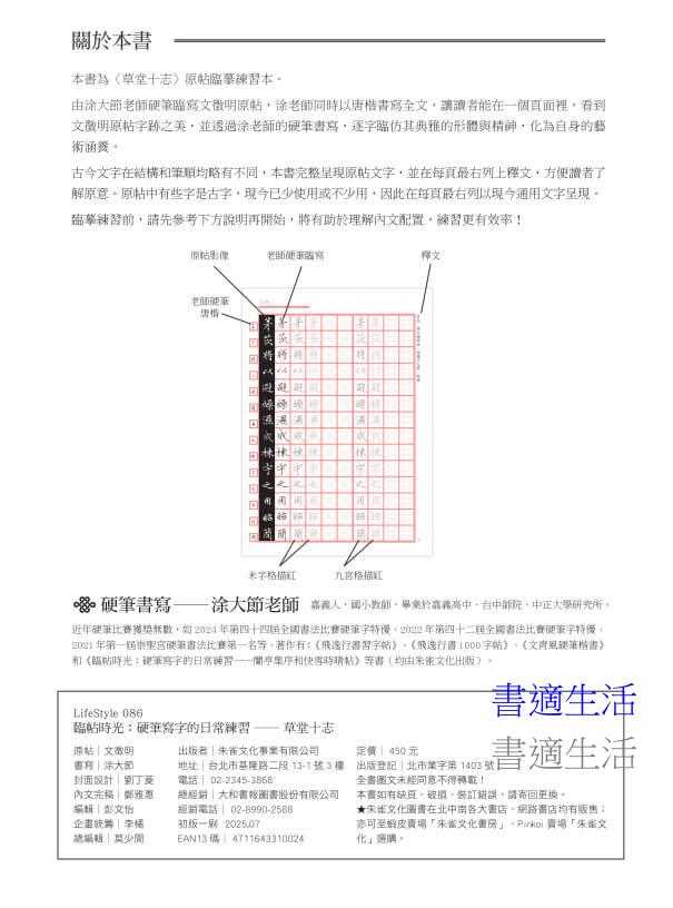 〈草堂十志〉原帖、涂大節老師的硬筆臨寫,以及對照的唐楷全文,三者並陳於同一頁面。讀者在欣賞〈草堂十志〉楷書原貌之美的同時,還能透過涂老師細膩的硬筆臨寫,一字一形,體會其典雅端莊的書體精神,進而沉浸於臨帖之樂,涵養自身的藝術氣韻。