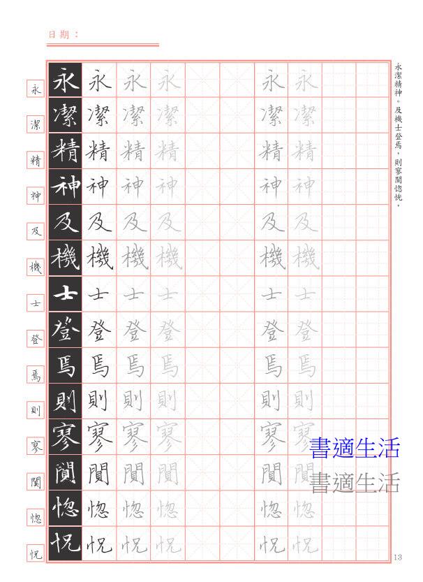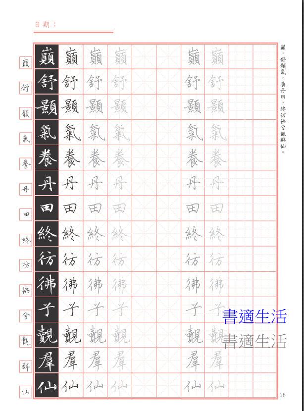 古今文字在結構和筆順均略有不同,本書完整呈現原帖文字,並在每頁最右列上釋文,方便讀者了解原意。原帖中有些字是古字,現今已少使用或不使用,因此在每頁最右列以現今通用文字呈現。