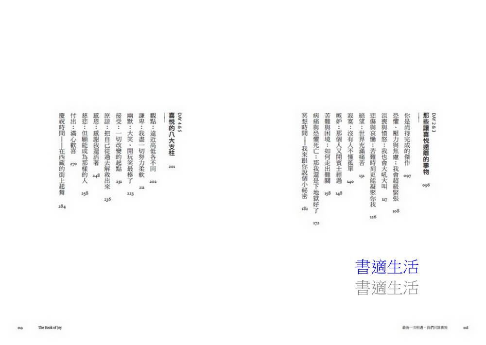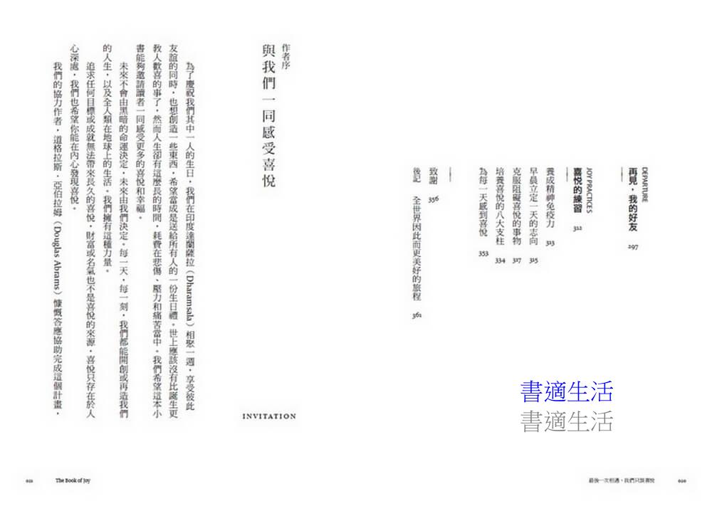 書中除了兩人時而幽默逗趣,時而深刻感動的對談,分享他們對人生的體悟與許多真實故事,也從探討喜悅的本質、結合科學實證分享跨越負面情緒的方法──嫉妒、恐懼、孤獨、焦慮、失去的苦痛等,到獲得喜悅的八大心靈支柱,分享他們穿越苦痛的智慧。同時列出他們日常安頓內心的功課,讓讀者也能練習感受喜悅。
