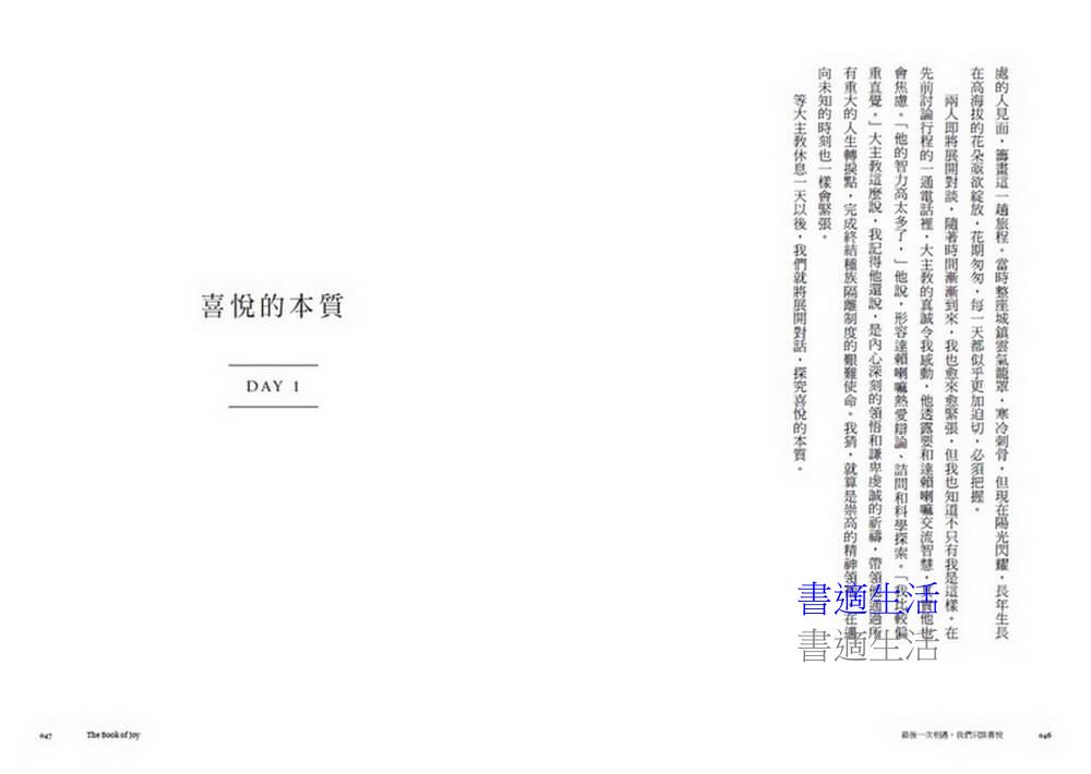 大主教從未自稱聖徒,達賴喇嘛也稱自己只是一介僧侶,他們的人生嚮往,與你我並無不同。兩人的人生看來充滿混亂與苦痛,卻能在其中尋得平靜、勇氣與喜悅。他們說,苦為人所不能免,但我們可以選擇如何面對苦痛,我們都能學會在充滿挫折與苦痛的環境,依然懷抱喜悅而活。