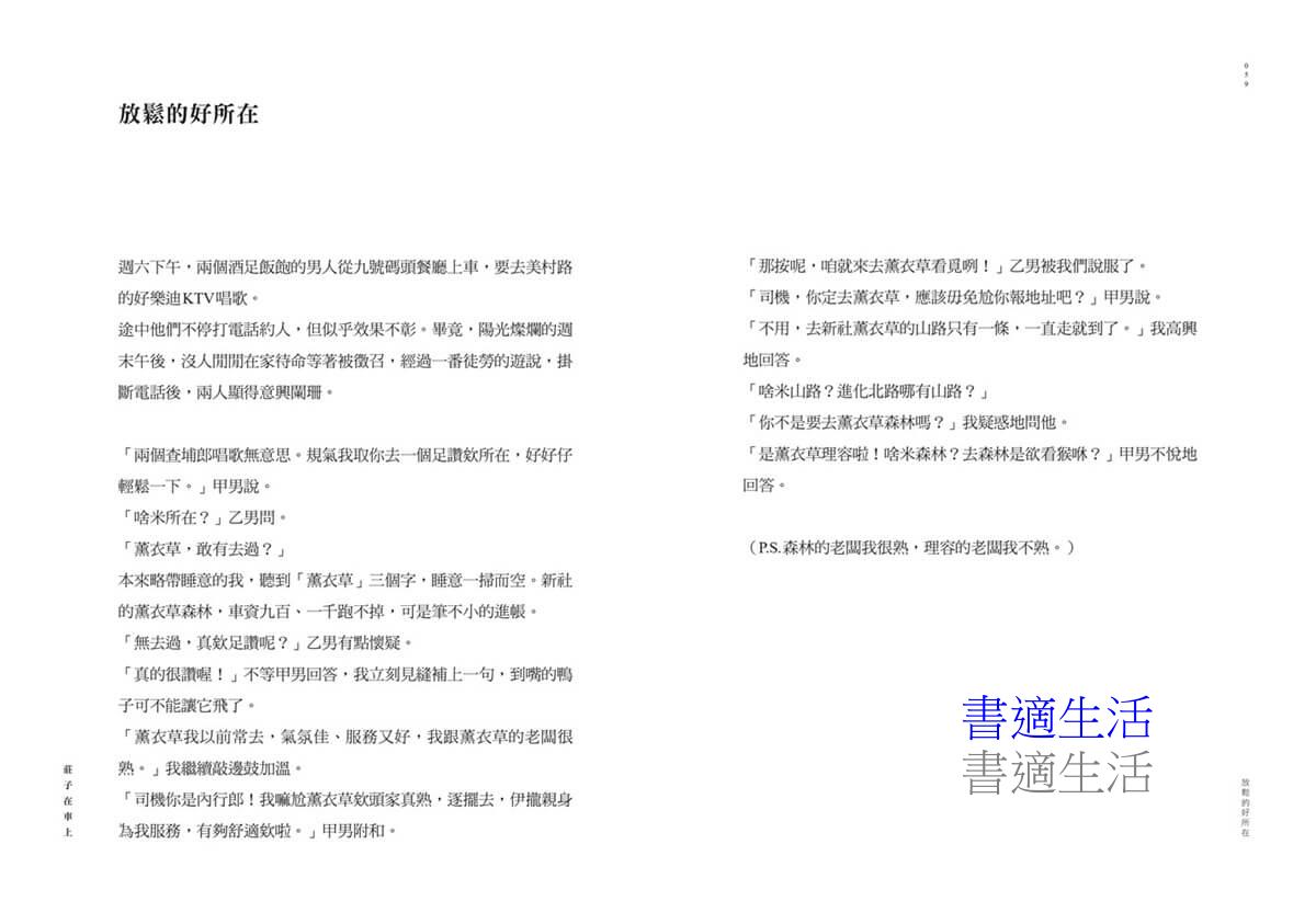 ●「這本書的文字,做到了莊子的姿態──逍遙而不放縱,自在而不逃避。作者在每一場載客的路程中,凝視人性;在每一段靜默的相逢裡,生出理解。」──王村煌(薰衣草森林董事長)