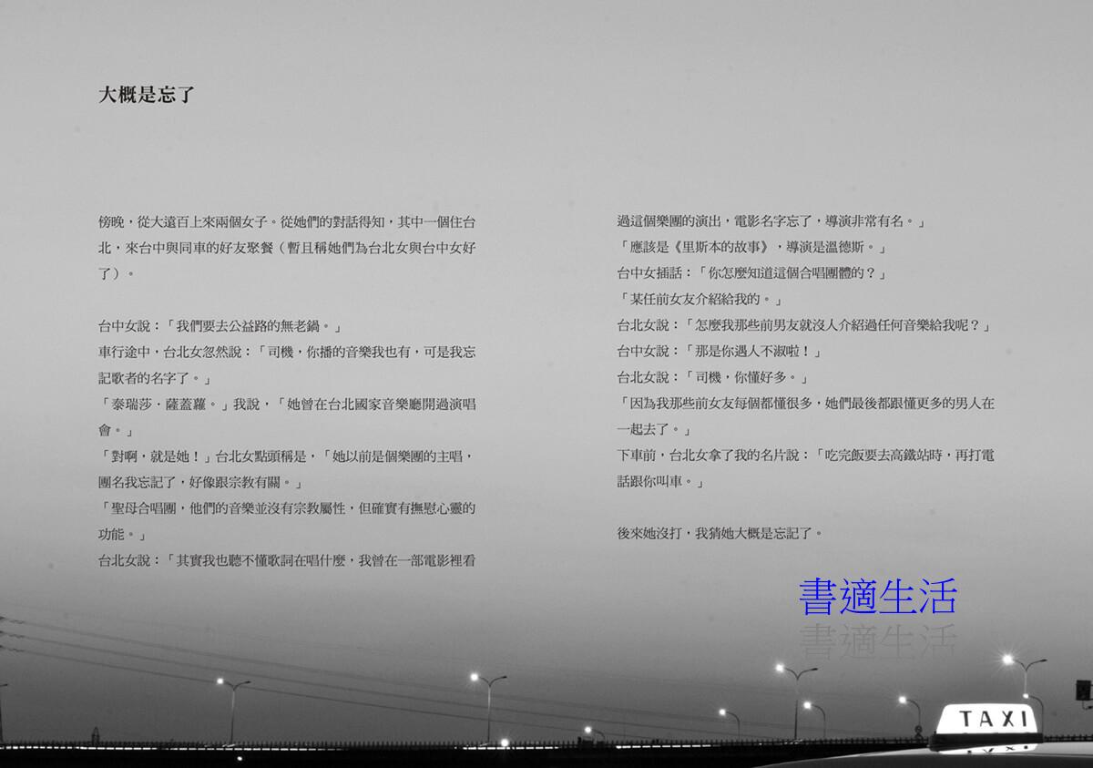 ●乘客於我,彷彿是被拍攝的風景,攝影者不會干預風景,能做的只有專注等待「決定性瞬間」的到來……多數時候,他們靜靜地聽著音樂,直到抵達目的地下車,然後各奔陌路,彼此相忘於江湖。這些日復一日的常態中,偶爾也閃現短暫交會、互放光亮的時刻。我以文字代替相機,定格這些飛鴻踏雪般的相逢。