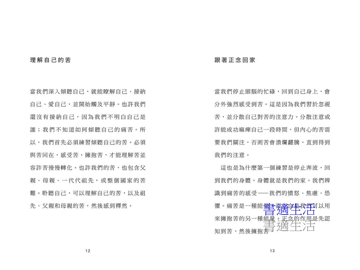 忙碌的現代人往往忘記日常生活中行、住、坐、臥是什麼滋味。本系列用不囉唆卻發人深省的簡短段落,讓人在紛擾世界中,隨時隨地,念念清明。全套完整收集,體會一行禪師的日常禪法。