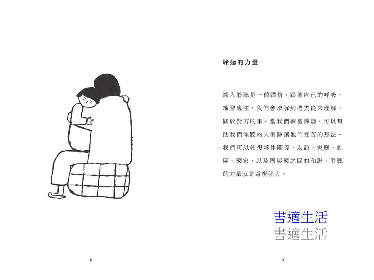 一行禪師的方法非常直觀,從聆聽、感受下手,講的是一般人都能體會、理解的方法。尤其是被忙碌生活節奏帶著走的都市人,更能在一切回歸簡單的過程中,找到自己,碰觸生命的肌理,實實在在感受生活的喜悅。