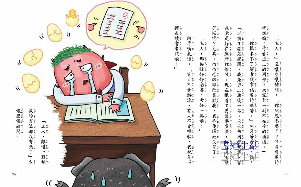 魔鬼阿牙長得很可怕,他有一對短短的角、一頭稀稀的綠髮、兩根小小的尖牙,屁股後面還有一條帶刺的尾巴。他剛從地獄魔鬼學校畢業,急急忙忙跑出來,想要嚇人,想不到,不但沒有任何一個人類嚇到,他反而被人類嚇得慘兮兮!怎麼會這樣呢?阿牙心想:巫婆身邊有黑貓,吸血鬼頭上有蝙蝠,如果我能找到一個長相非常醜的動物做僕人,一定能成功的嚇死人……