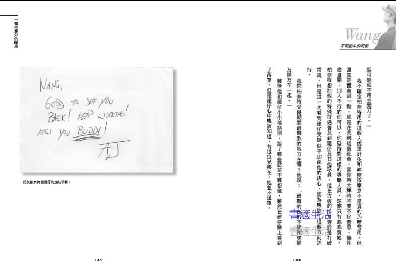 駐美記者龔邦華七年貼身採訪實錄,詳細剖析王建民與教練、隊友的互動,以及他受傷開刀之後面對的種種挑戰,紀錄他被洋基釋出,等待新球團接洽,到最後落腳國民隊的決定。這一路的心情轉折,不只是建仔一個人的痛,也是更多企望攀上大聯盟的台灣好手們,共同的心聲與課題。