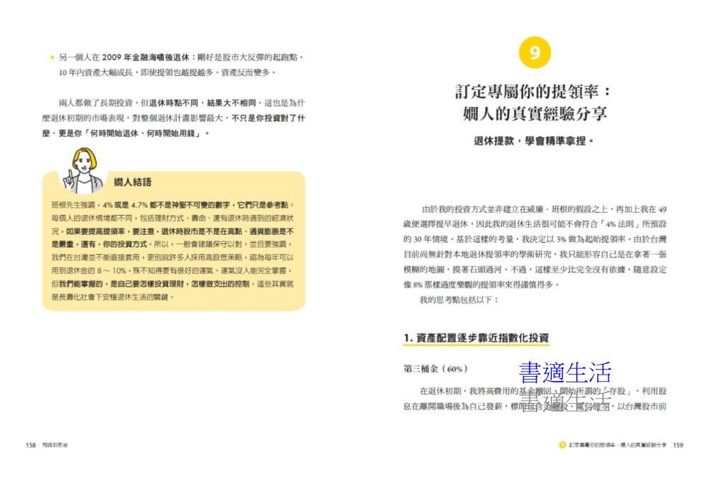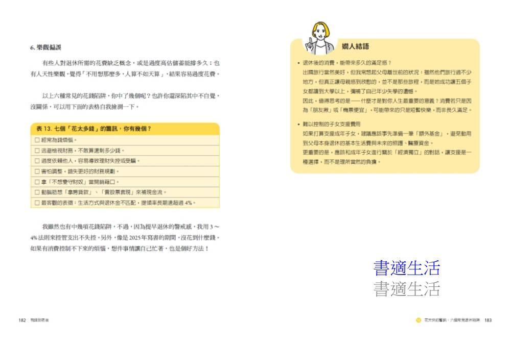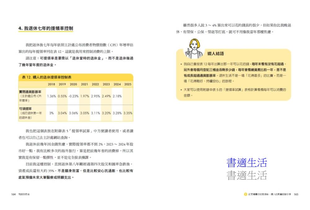 書中深入解析威廉.班根的「4% 法則」,並結合嫺人八年的退休實踐,提出更符合現實的「3%+通膨」提領法。她提醒讀者:何時該保守、何時可多花,才能讓退休金和生命同樣長壽,花得安心也花得剛好。