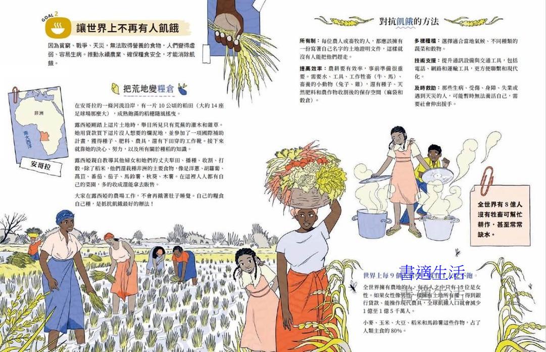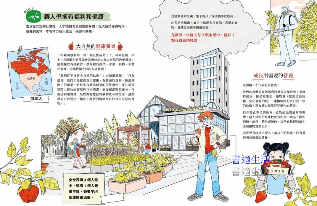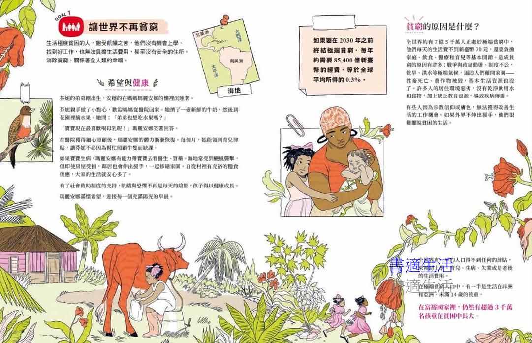 本書以聯合國永續發展目標(SDGs)為主軸,呈現17則來自全世界的真實故事,對應氣候變遷、貧窮、飢餓、不平等、教育資源等目標議題。