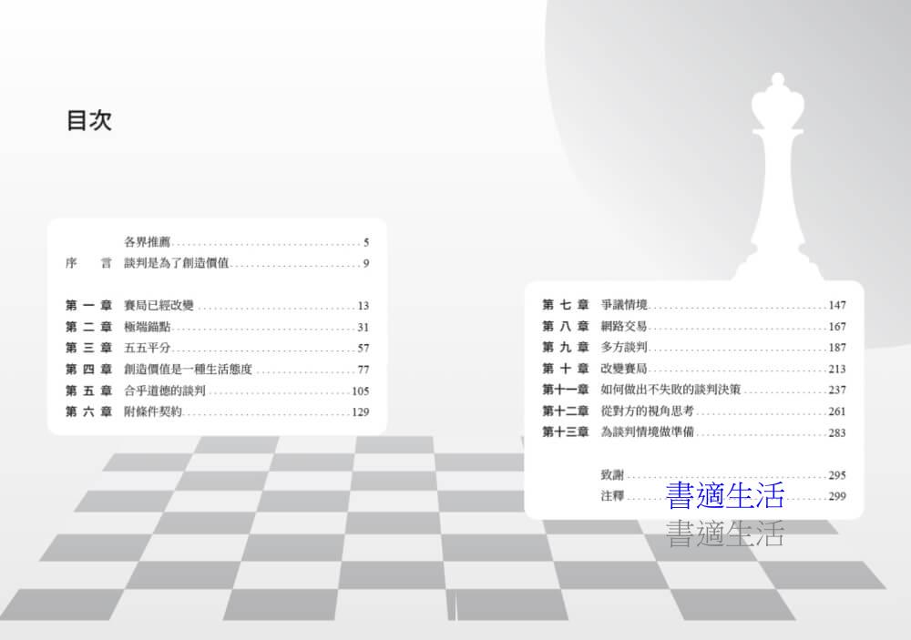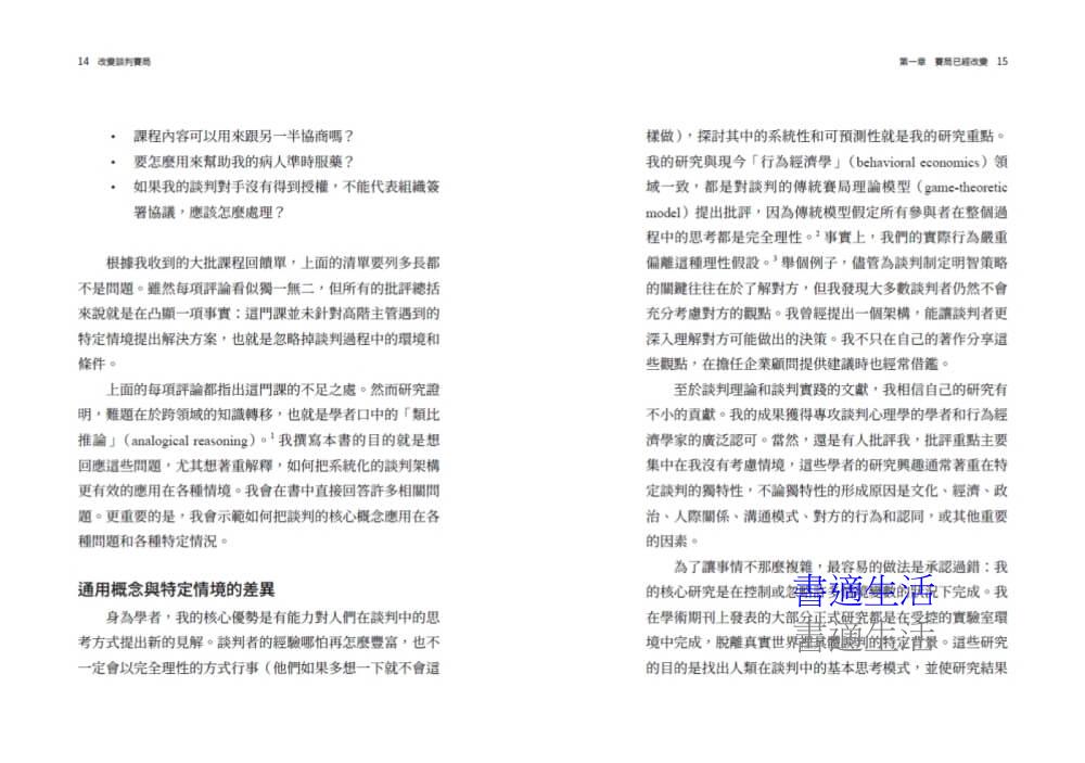 本書作者貝澤曼是國際知名的談判專家,在哈佛商學院專為高階主管開設「改變賽局」課程,他發現在談判中,獨特的情境會影響談判方式。在這本書中,你可以學到:
