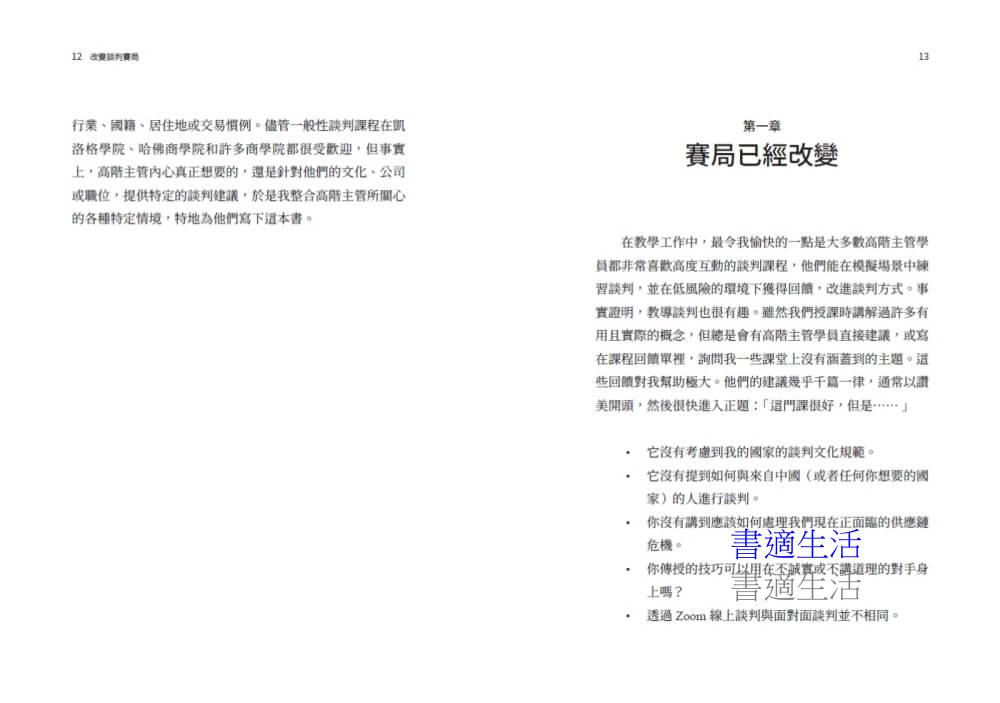 貝澤曼精闢的指出,面對涉及文化、政治、人際關係、經濟實力和溝通模式的全新情境,我們需要調整驗證過的有效談判概念。同樣精闢的是,他不僅說明這種調整過程的必要性,還示範如何以最佳方式進行調整,最終成就這本傑作,教導我們靈活的運用談判技巧。