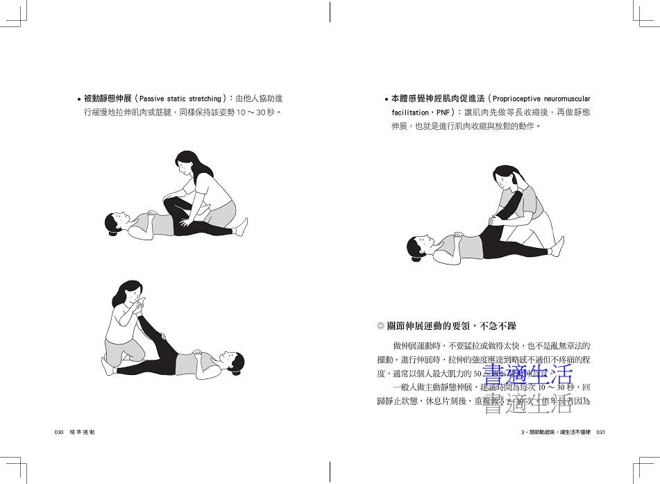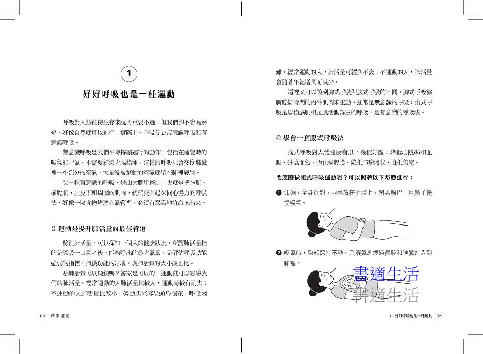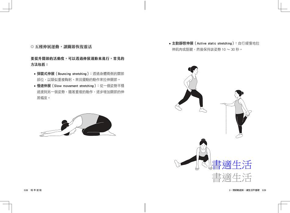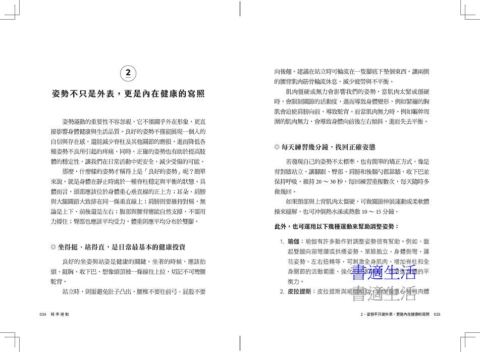 全書共分四部分:第一章說明建立運動與健康的基本觀念;第二章介紹從呼吸、心肺、肌力到身體協調力的9種基本運動;第三章推薦14種有益健康的活動;第四章提供超過30種常見疾病與身體問題的運動建議。不論你是血壓偏高、血糖不穩、關節疼痛、焦慮失眠,甚至是罹患癌症、巴金森氏症或經歷中風,都能找到具體、溫和且可執行的運動策略。