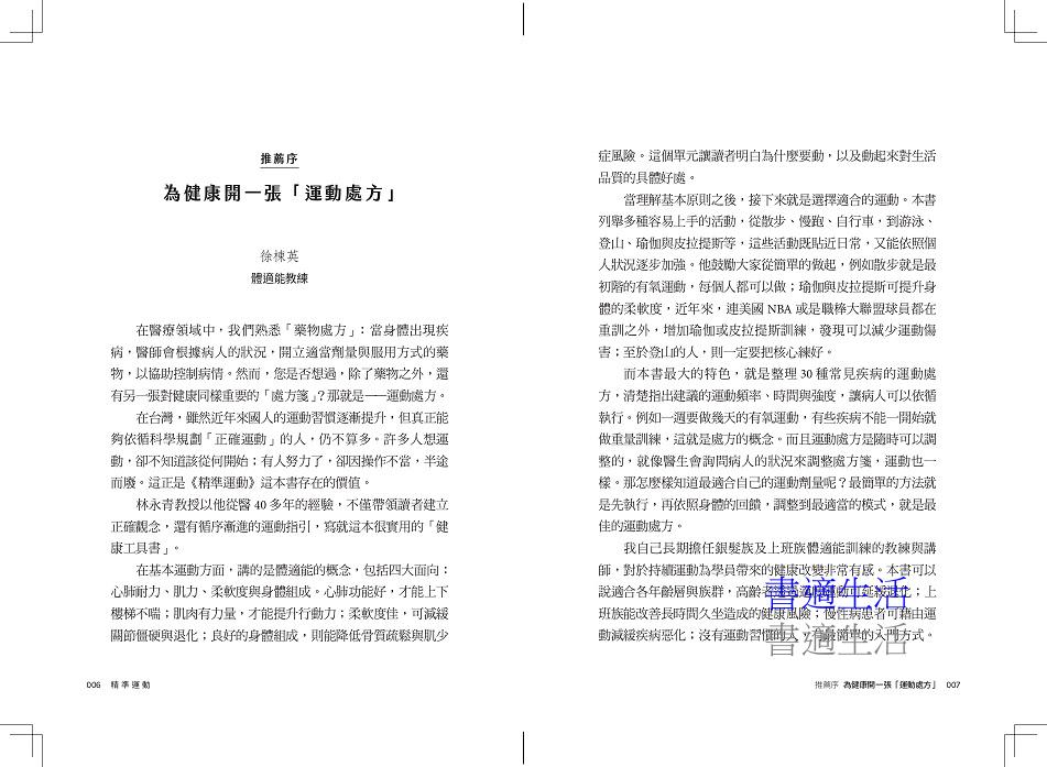本書適合各年齡層與族群,不僅會改變您對運動的看法,更可能改變您的生活方式,也是醫生為病人開立運動處方很好的參考指南。要活就要動,而動得精準,就能活得更健康。──徐棟英 體適能教練