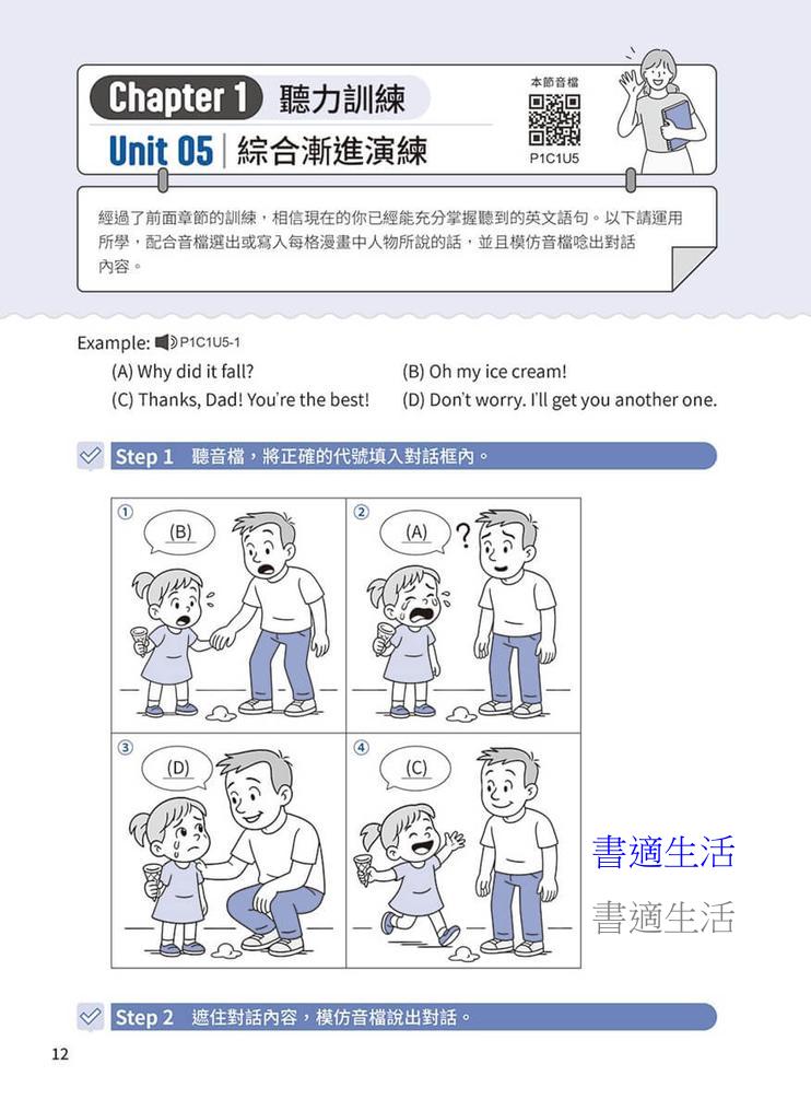 1. 聽力訓練(Chapter 1):從「反覆精聽」開始,教你抓大意、分辨主詞動詞、聽語音變化(如連音、弱讀、同化、省音),再進階到聽寫、跟讀模仿、拆解分析,最後綜合漸進演練。搭配漫畫情境練習,強化即時理解與語感,讓你聽題目不再霧煞煞!