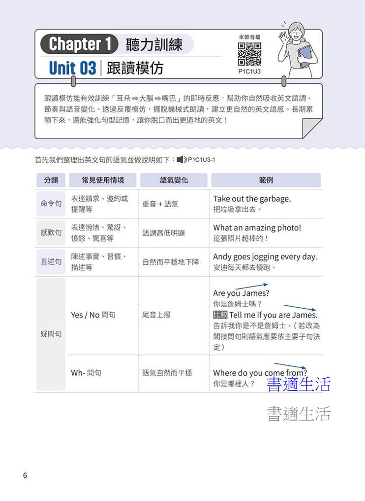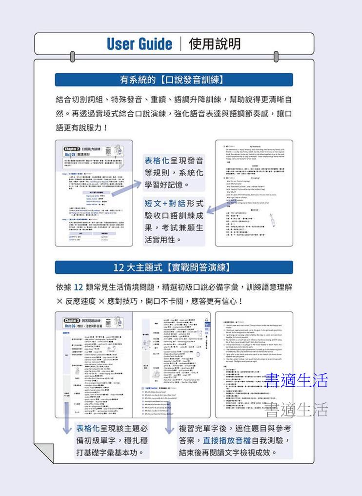 2. 口語能力訓練(Chapter 2):針對發音不準的問題,從「理解文字 & 切割詞組」入手,教標記重音及連音、特殊發音規則、加入情緒、錄音比對改進。讓你的口說更清晰、自然、有節奏感,避免考官聽不懂。