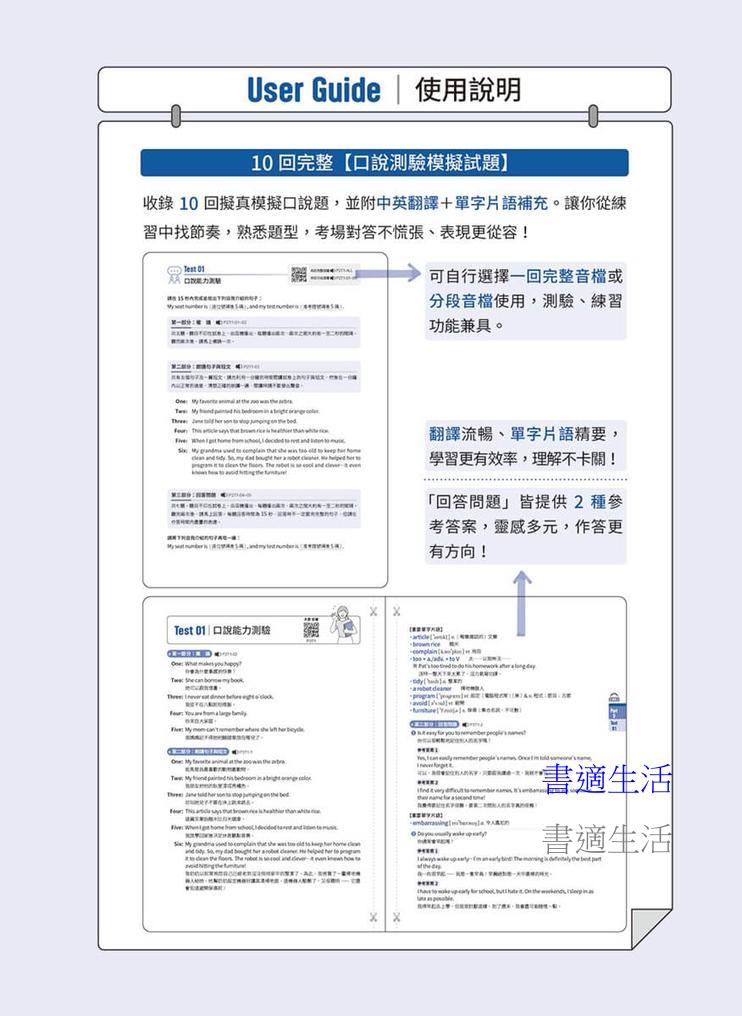 收錄10回「全真」模擬口說題,並附中英翻譯+單字片語補充。讓你從練習中找節奏,熟悉題型,考場對答不慌張、表現更從容!