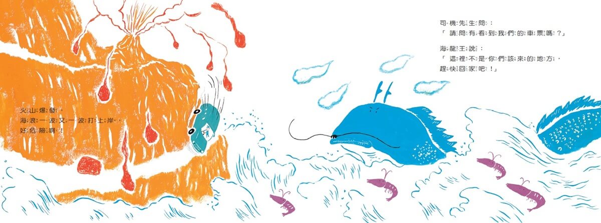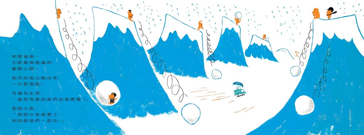 在這本橫掃國內外大獎的作品裡,繪本作家劉旭恭以橘色和藍色為主色調描繪,用帶有童趣的質樸筆觸勾勒,活潑的線條和大面積的色塊,表現出活力滿滿的氛圍。他獨特的幽默感,讓這個看似天馬行空的故事,多了一點哲思與溫度。司機先生為了追回被風吹走的車票,不管前方有多危險,即使受到勸阻、威脅、利誘等,也絲毫不受影響,堅持信念,一路往前追;雖然乘客不是主角,卻各有各的特色:老先生、上班族、帶菜籃車的太太、小學生、帶寶寶的公主……儘管身分不同,他們卻不分彼此,與司機先生一起翻山越嶺追車票。對了,別忘了在圖中找找小狗的身影,牠可是司機先生的好幫手喔!
