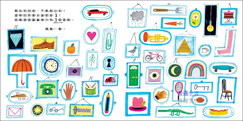 你以為數到一很容易?一顆蘋果、一隻鯨魚、一塊蛋糕,或是太空中的一隻恐龍,一隻帶著眼鏡的金魚……張大眼睛,雖然只數到1,卻充滿驚奇和樂趣!