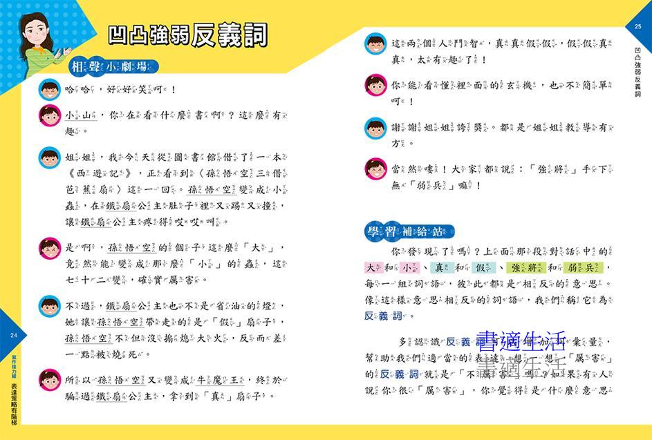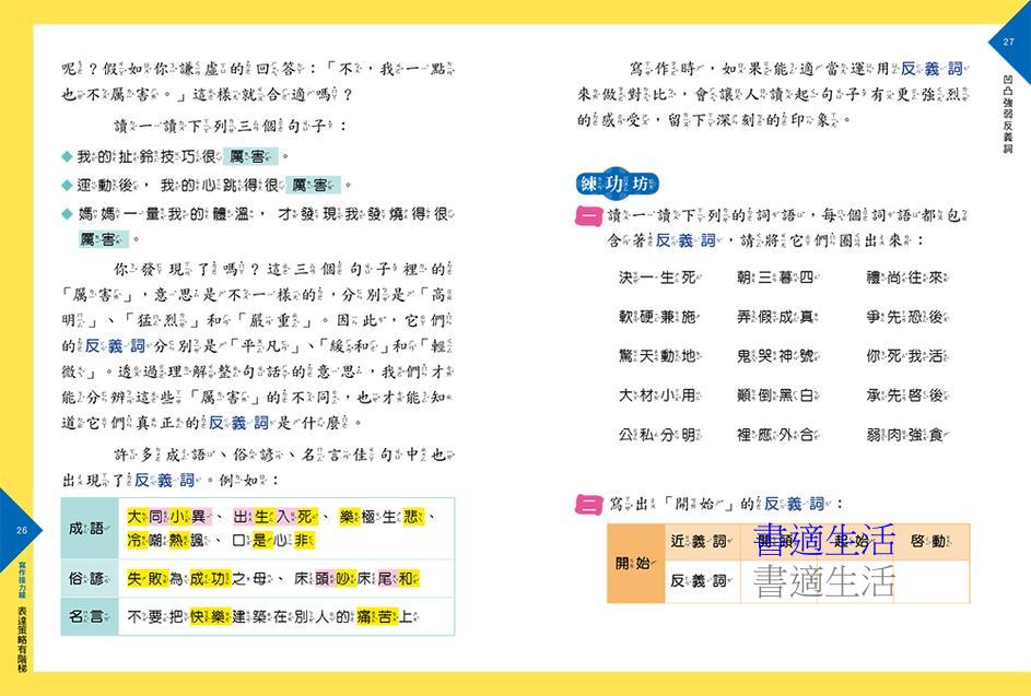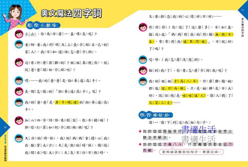 本書適合中年級使用,著重各種詞語、句型、修辭、表達技巧等訓練,讓讀者得以輕鬆、有系統的加強寫作能力。