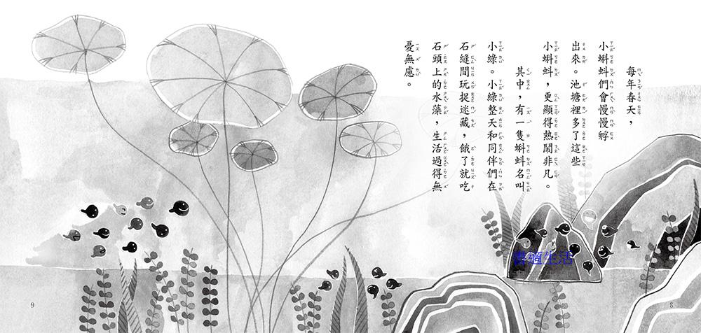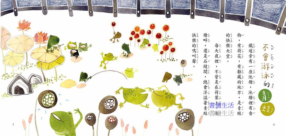 沒有人是完美的,也不是每個人生來都很幸運。故事中的小綠出生時就沒有蹼,沒辦法像其他小青蛙一樣「天生就會游泳」。好在有一群關心他的朋友,體諒他的不方便,陪伴他嘗試各種可能學會游泳的方法。這些好朋友發自內心的關懷,給了小綠無形的力量,讓他沒有壓力,終於學會游泳,在快樂與自信中成長。