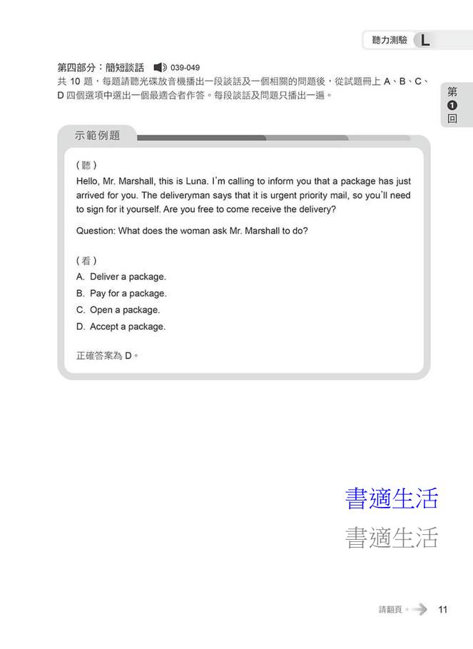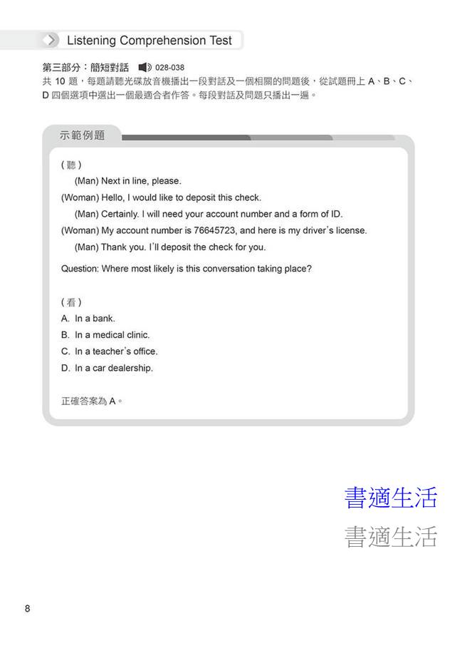 本套書難易度故意設定為比實際考試再難一點,讓你在考場上游刃有餘,輕鬆超越預期目標。聽力音檔由專業外籍錄音老師錄製,發音標準清晰,可掃描QR Code即時聆聽,讓你隨時進行最逼真的聽力測驗!