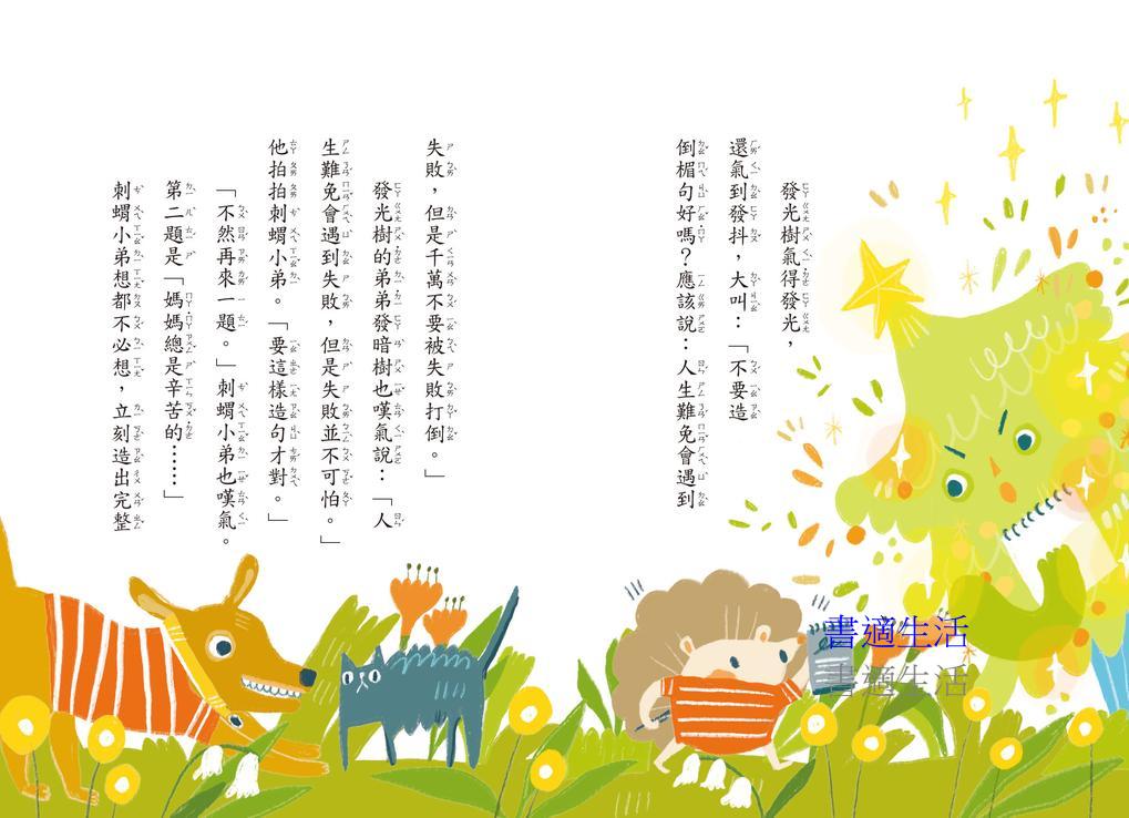 松鼠先生開了一家「造句練習店」,發光樹和發暗樹來幫忙。刺蝟小弟上門光顧,造出的句子總是出乎意料,讓發光樹氣得全身亂閃……刺蝟小弟造了什麼句子呢?