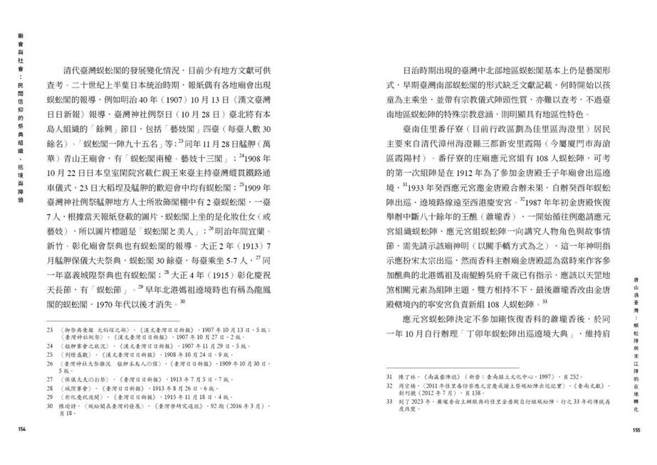 這部作品收錄了作者二十年來研究的精華,精選七篇未曾集結出版的關鍵論文,並加以大幅增修,部分篇章甚至是近乎一半的改寫。全書透過歷史學的嚴謹考證,輔以地理資訊與數位工具的現代方法,結合親身走訪廟會現場的細膩觀察,為讀者揭開臺灣廟會活動背後複雜而迷人的歷史文化意涵。