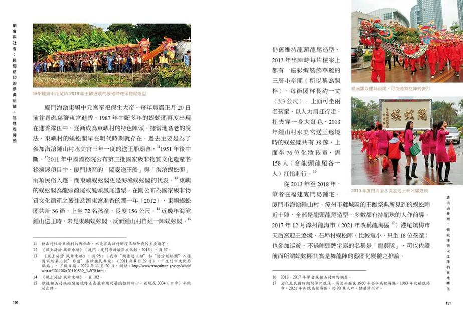 廟會中最吸睛的陣頭,往往蘊含著最深刻的文化密碼。第四章〈唐山過臺灣〉與第五章〈古儺遺風〉,聚焦於蜈蚣陣與宋江陣這兩大代表性陣頭,探討其從閩南原鄉來到臺灣後,如何在新的環境中發生質變。