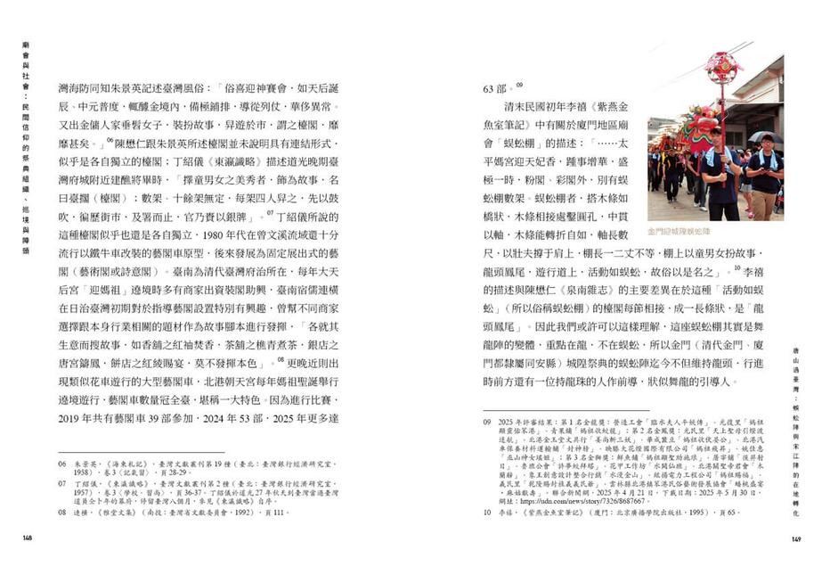 在現代化浪潮下,傳統庄頭陣為何能在某些地區(如曾文溪與二仁溪流域)頑強地存續?第六章〈文化傳承〉與第七章〈地方自治〉從社會文化與經濟層面給出了答案。作者指出,庄頭陣的維繫,根植於地方的集體認同與為神明服務的奉獻精神。特別是二仁溪下游地區,更發展出融合了殖民文化遺產(如御輿團)與戰後流行文化(如素蘭陣)的創意陣頭,展現了臺灣社會巧妙平衡傳統與現代的驚人韌性。
