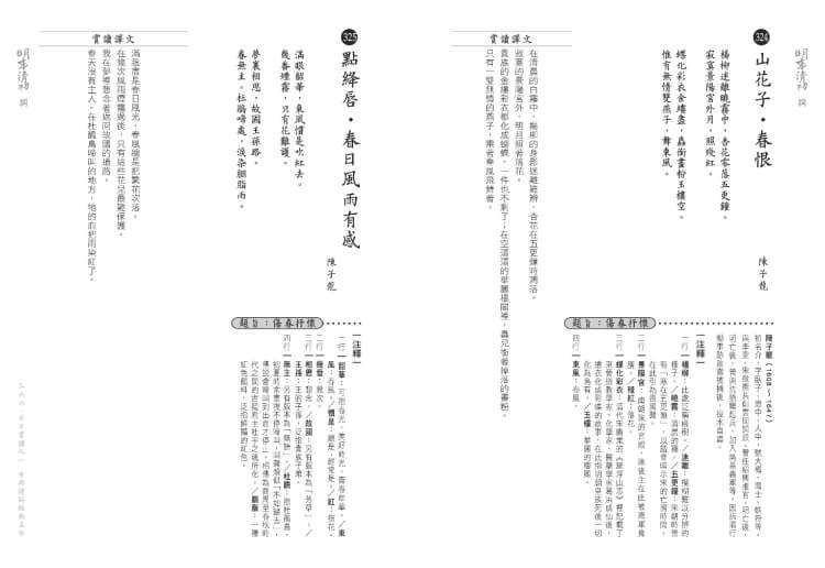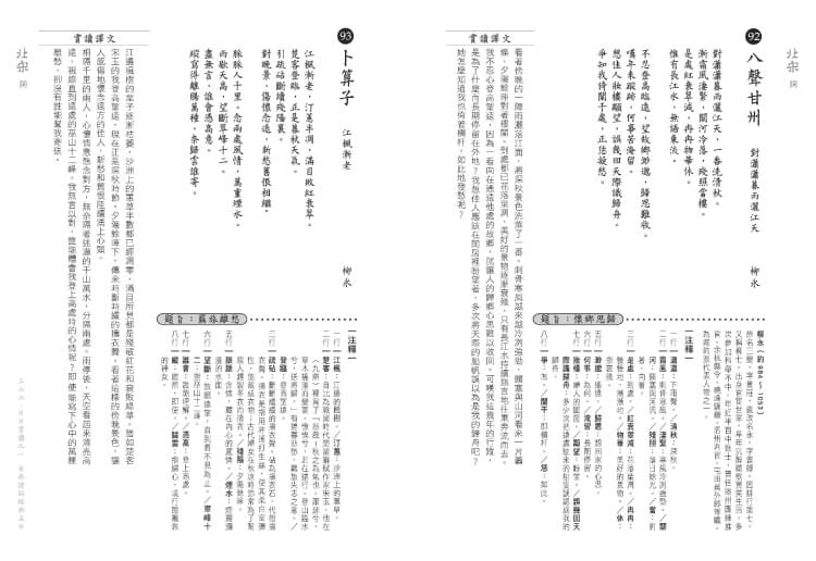 ‧注釋:力求簡要精準。為了避免注釋編號影響賞讀,詩詞裡不加注釋編號,而是在注釋處註明詞彙所在行列,供讀者對照閱讀。此外,為了方便讀者閱讀,不需前後翻查注釋,每首詩詞皆附有完整注釋,因此相同詞語的注釋會重複出現。不過,相同詞語在不同詩詞中所用之意不見得相同,敬請注意。