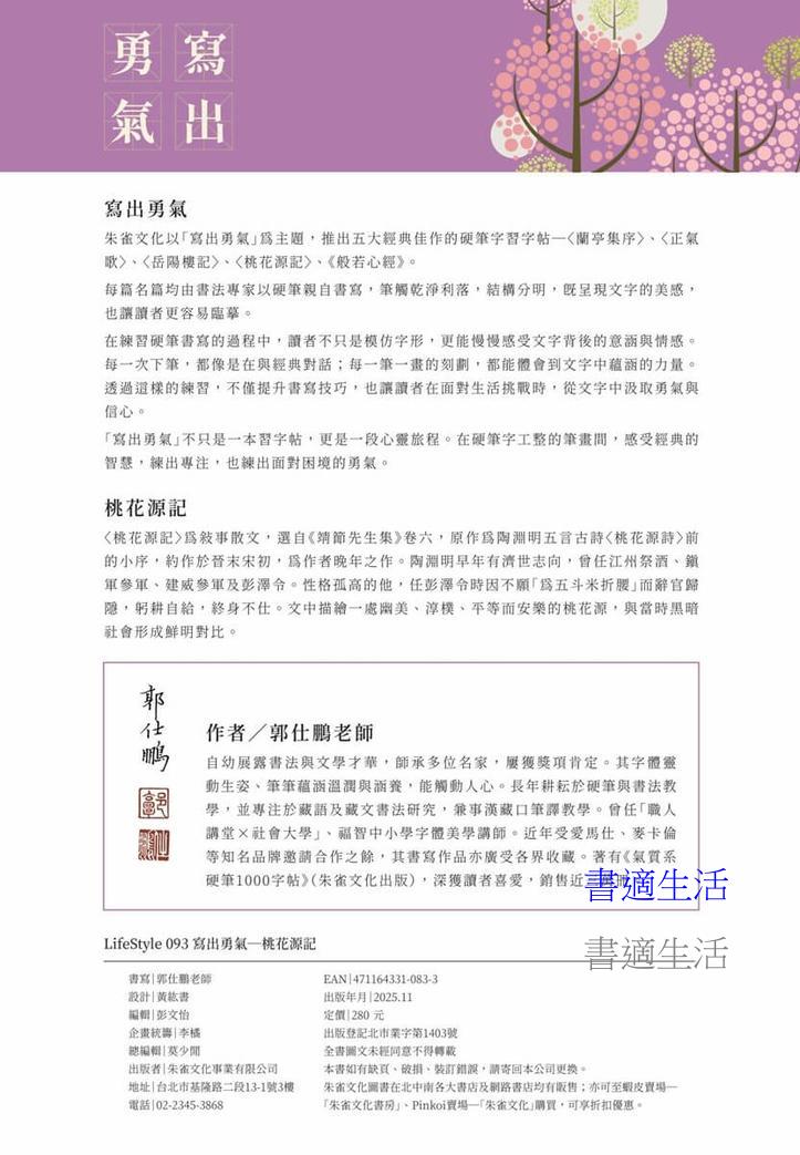〈桃花源記〉由長年耕耘於硬筆與書法教學的郭仕鵬老師以硬筆親自書寫,筆觸乾淨俐落、結構分明。系列結合老師示範手帖、描紅臨摹,搭配180度攤平膠裝,每日不間斷練字,不僅汲取經典正能量,也能搭配落款,留下屬於你的專屬勇氣作品。