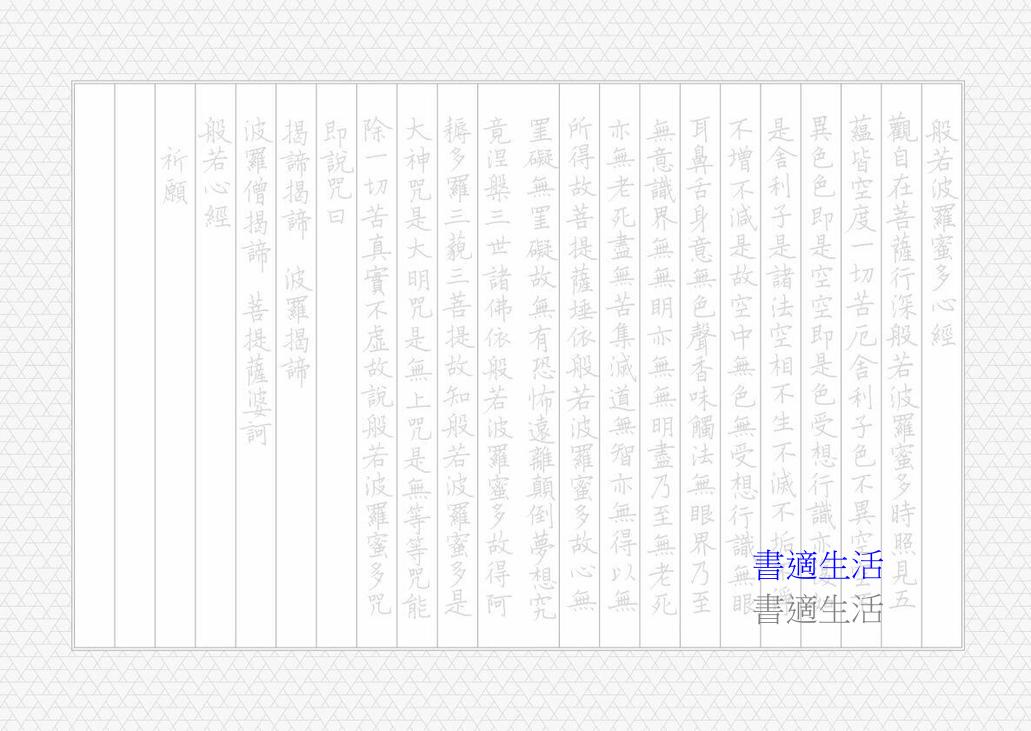 觀自在菩薩行深般若波羅蜜多時照見五蘊皆空度一切苦厄舍利子色不異空空不異色色即是空空即是色受想行識亦復如是舍利子是諸法空相不生不滅不垢不淨不增不減是故空中無色無受想行識無眼耳鼻舌身意無色聲香味觸法無眼界乃至無意識界無無明亦無無明盡乃至無老死亦無老死盡無苦集滅道無智亦無得以無所得故菩薩住般若波羅蜜多故心無罣礙無罣礙故無有恐怖遠離顛倒夢想究竟涅槃三世諸佛依般若波羅蜜多故得阿耨多羅三藐三菩提故知般若波羅蜜多是大神咒是大明咒是無上咒是無等等咒能除一切苦真實不虛故說般若波羅蜜多咒即說咒曰揭諦揭諦波羅揭諦波羅僧揭諦菩提薩婆訶