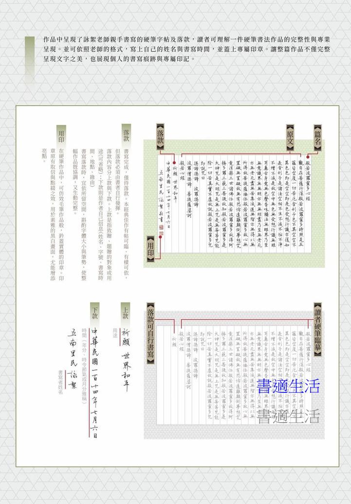 《般若心經》由愛好書法的詠絮老師以硬筆親自書寫,筆觸乾淨俐落、結構分明。系列結合老師示範手帖、描紅臨摹,搭配180度攤平膠裝,每日不間斷練字,不僅汲取經典正能量,也能搭配落款,留下屬於你的專屬勇氣作品。
