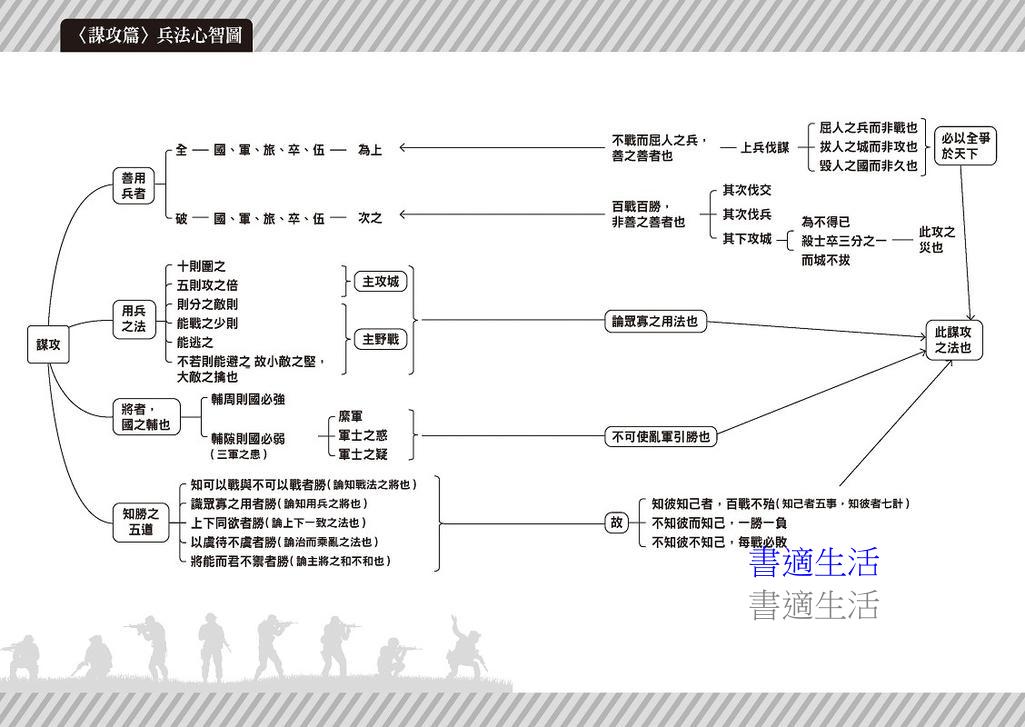 作者將難懂的文言文,轉化為一目了然的心智圖,讓讀者一眼就能看懂《孫子兵法》13篇的核心思維。