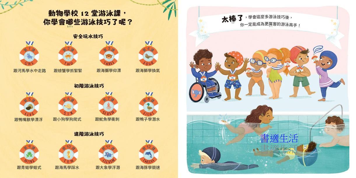 ✔可愛生動的動物插畫,搭配3~5步驟動作拆解與示範,讓孩子在玩樂中輕鬆學會游泳技巧。