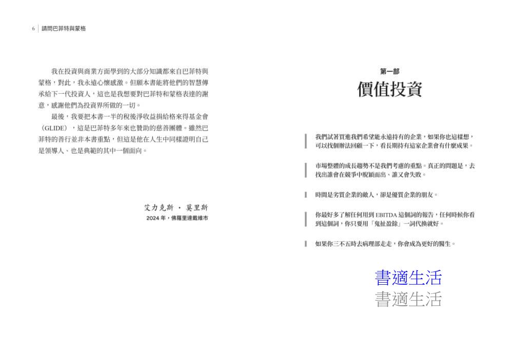 股票分析師暨財經作家艾力克斯.莫里斯研讀1994年至2023年間數百小時的股東會影片、超過1,700個股東提問,最終匯整成這本智慧結晶。他將最具啟發性的內容精心整理與編輯,呈現兩位大師的思考全貌: