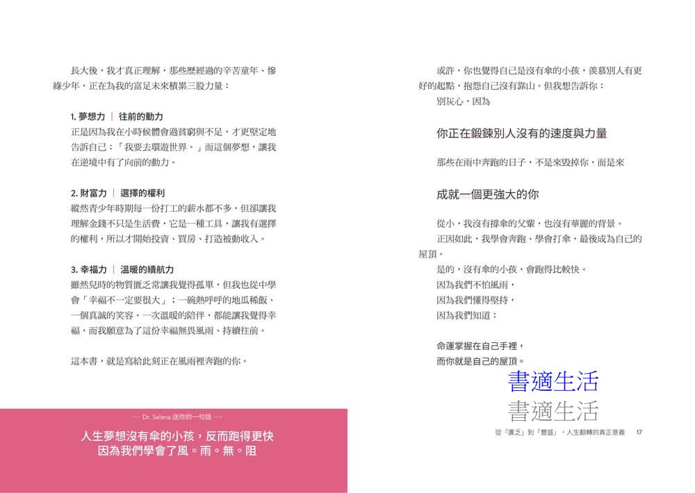 這不是一本冷冰冰的理財工具書,也不是一套讓你一夜暴富的投機指南,而是一趟從匱乏、自卑,走向豐盛、富足的翻轉之旅。從九份山城的貧困童年,走向環遊世界70餘國,不到50歲實現財務自由,作者Dr. Selena楊倩琳以自己的人生證明——無論起點多低,你都能跑出別人沒有的速度與力量,成為自己的屋頂。