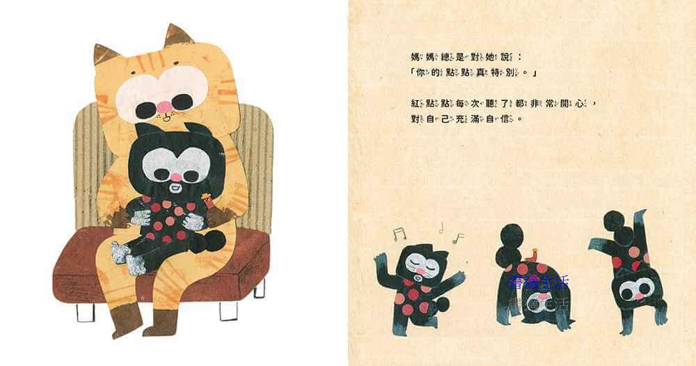 「我再也不是紅點點了⋯⋯」小貓咪難過地想。媽媽靜靜地陪著她,把那些掉落的點點撿起來,輕聲說:「我們來和點點說再見吧!有時候,失敗也是種養分。」