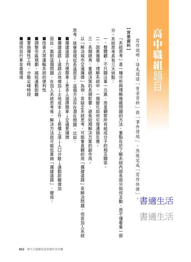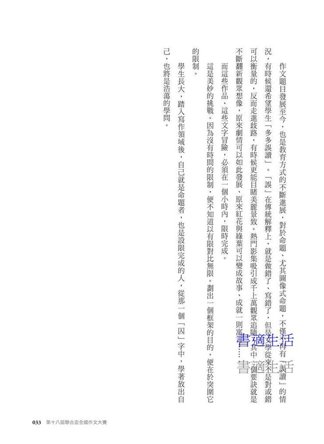 本書收錄第十八屆聯合盃全國作文大賽總決賽首獎、優選及各區初賽第一名文章。