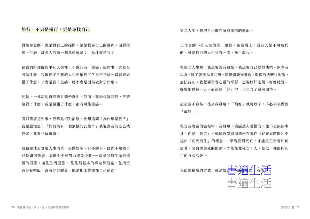 面對每三個月的回診、三年復發高峰、五年存活率關卡,作者意識到生命如此脆弱,時間如此緊迫,很多事現在不做,也許就沒有以後了,回顧來時那些「想要」,作者放下等待的選項,立刻去做。