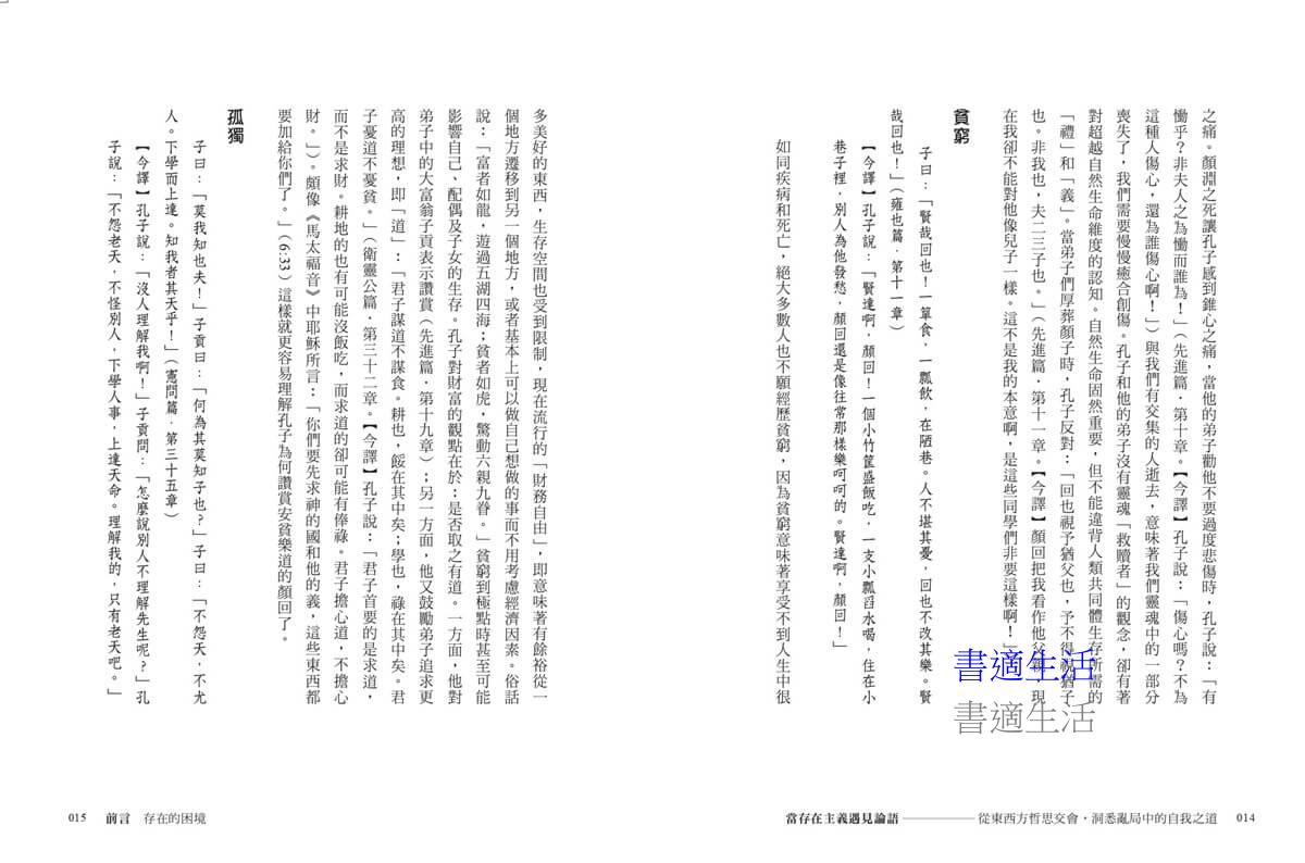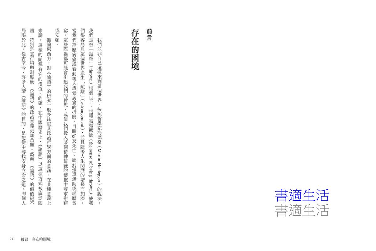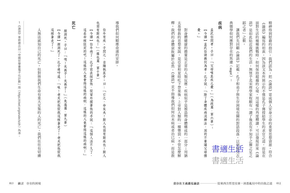 本書將以九個章節呈現《論語》的存在哲思。在《論語》中,我們看到裡面的人物會哭、會笑、會欺騙、會挖苦。他們與我們現代人一樣面臨疾病和死亡。當他們遇到存在困惑時,他們會有什麼反應。在前三章,我們將帶領讀者思考這些問題。