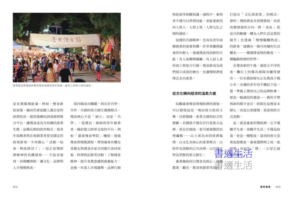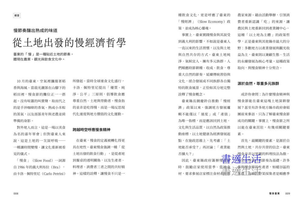 臺東自2015年起倡議慢食精神,藉由每年臺東慢食節落實內涵。臺東慢食強調「從土地出發的飲食行動」,是「從產地到餐桌」的透明關係,以及生產者、料理者、消費者三者之間的共好精神。這樣的詮釋,讓慢食不只是飲食文化,更呼應臺東慢經濟政策,並成為核心靈魂。2025年臺東慢食運動滿10年,透過本書讓外界更理解臺東慢食節發展的歷程與核心概念。