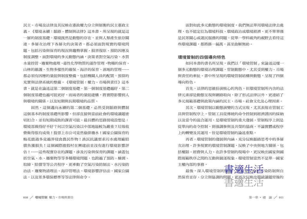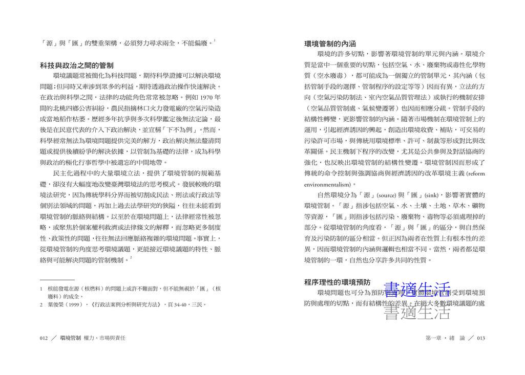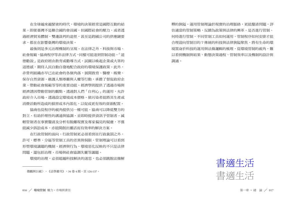 本書從結構與程序的視角,引領讀者深入理解臺灣的環境管制體系。環境的治理,必須超越科技解決的迷思,也必須跳脫法條解釋的狹隘,聚焦管制結構的多元要素,包括管制者、被管制者、管制目的、管制工具與執行手段。藉由將管制理論置於現實的治理脈絡,更能釐清問題,評估適當的管制策略,反饋為政策與法律的興革。書中涵蓋空氣、水、廢棄物、毒化物等污染管制,自然保育,以及環境影響評估、環境責任等重要議題,從環境管制的視角,探討臺灣環境治理的發展脈絡、制度困境及改革契機。