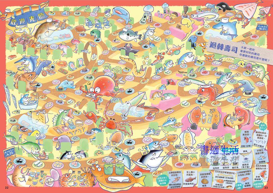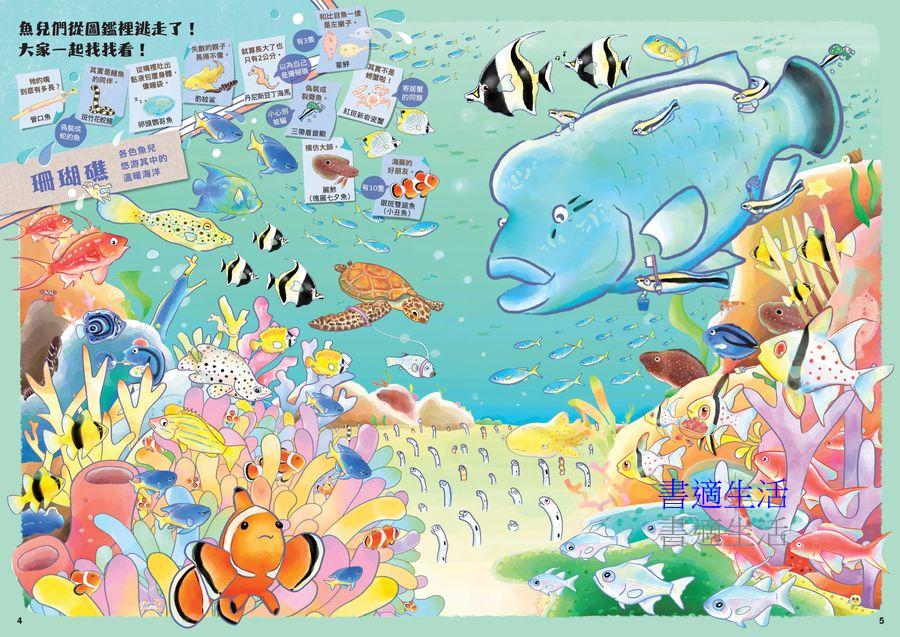 什麼?各種魚類逃跑了!來玩躲貓貓遊戲啦!發揮你的觀察力,把牠們都找出來吧!太平洋、日本河川、深海、遠古海洋,甚至是壽司店的輸送帶上,都有逃往各處的魚類蹤跡!有常見的魚類,也有鮮為人知的海洋生物,例如:可以躍出水面並滑翔400公尺的飛魚、壽命長達大約400年的小頭睡鯊、肚子餓了會自行切斷身體的皇帶魚、長得一臉瞧不起人的墨西哥月鰺、透過放屁來溝通的鯡魚……等,超多新奇有趣的海洋生物知識,等你來發現!