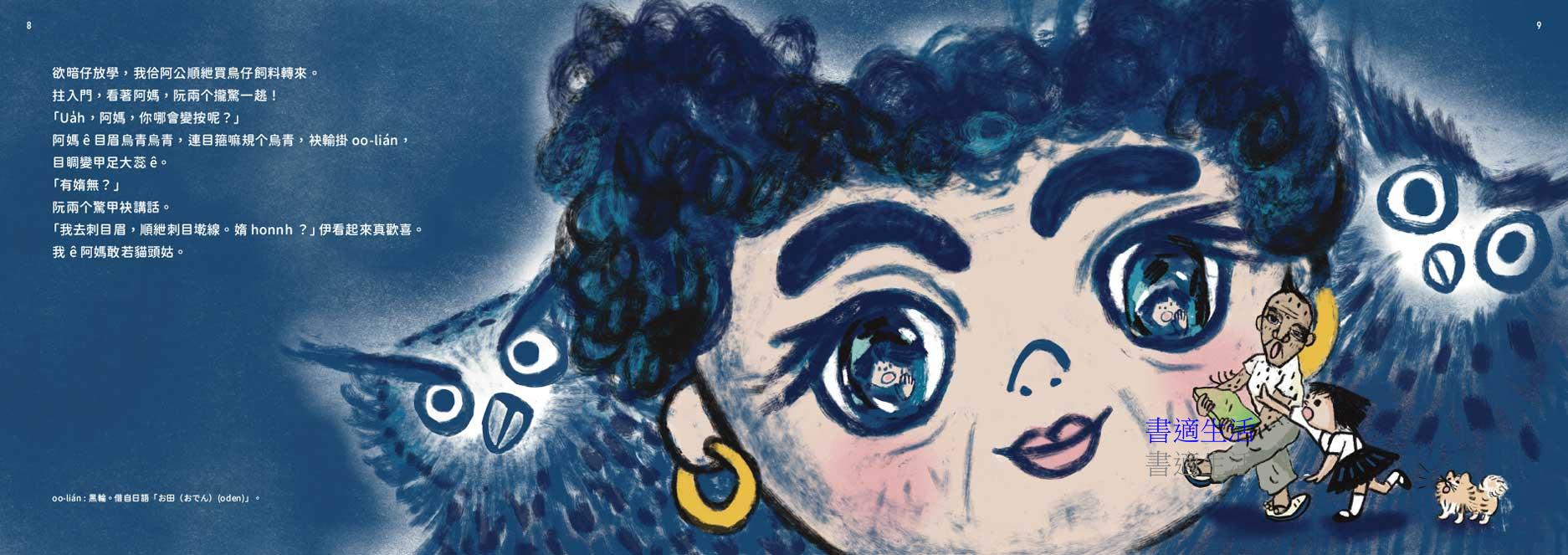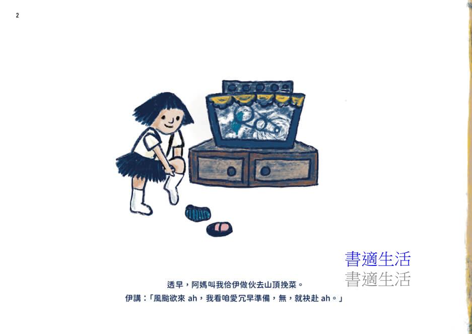《阿媽哪會變按呢?》是描述颱風天快要抵達前,阿媽帶著孫女到山上去摘採野菜做備災準備,但在這個同時,阿媽去做一件從來沒有做過的事——她跑去紋眉!!
