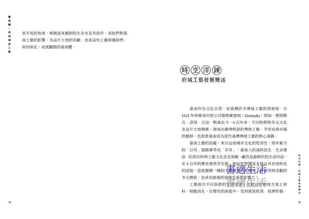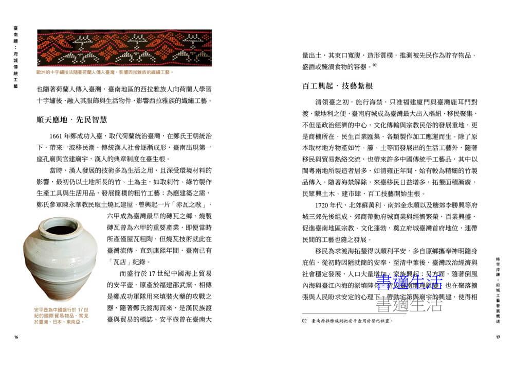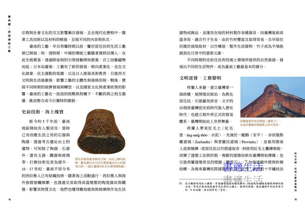書中〈時空淬鍊〉一章,回溯府城工藝四百年的發展,從「赤崁磚」到「紅毛土」、從官廟匠師到民間師傅,揭示工藝如何在不同政權、不同時代的激盪下持續變形。工藝,不僅是生活的器物,更是時代的語言——它講述了誰來過、誰留下、誰仍在延續。
