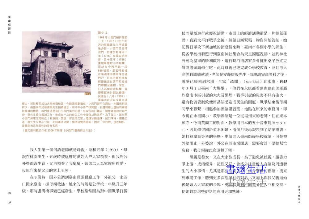 .書中不乏對老臺南人溫潤、細膩、嚴謹性格的描繪。例如作者透過母親回憶日治末期戰火下的生活,以及戰後學習國語、進入市場工作的經歷。