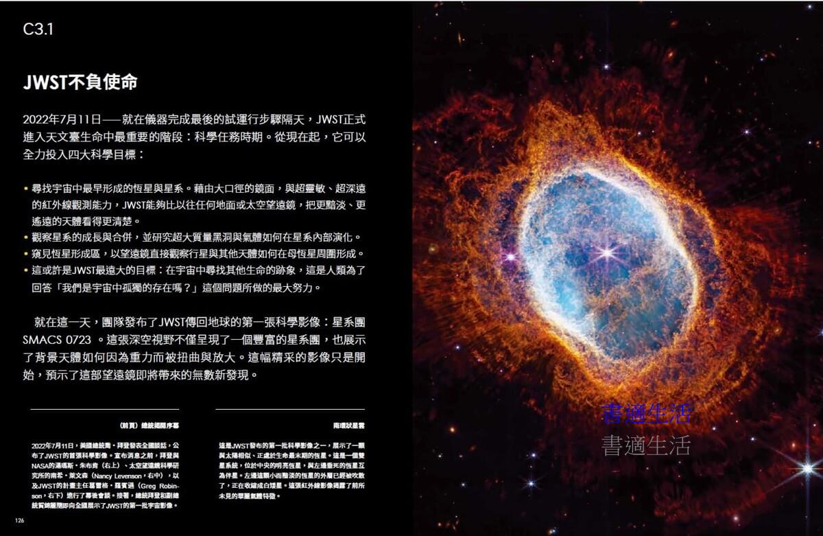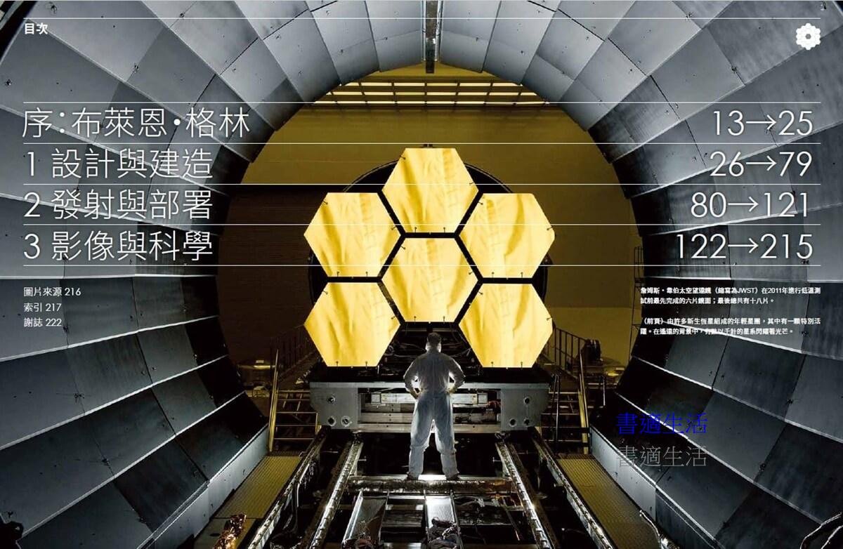本書為韋伯望遠鏡進行了最新、最全面的介紹,詳細描述了這座巨大太空望遠鏡的數十年傳奇故事,從規畫、建造到測試、升空,最後抵達距離地球約150萬公里軌道上完成部署的完整過程。而後續回傳的一幅幅驚人影像,為我們揭露了宇宙前所未有的面貌,作者伊森・西格是鑽研大霹靂的理論物理學家,透過輕鬆的文字和精細的資訊圖表,說明韋伯望遠鏡這些影像的重要性和從中獲得的新發現。