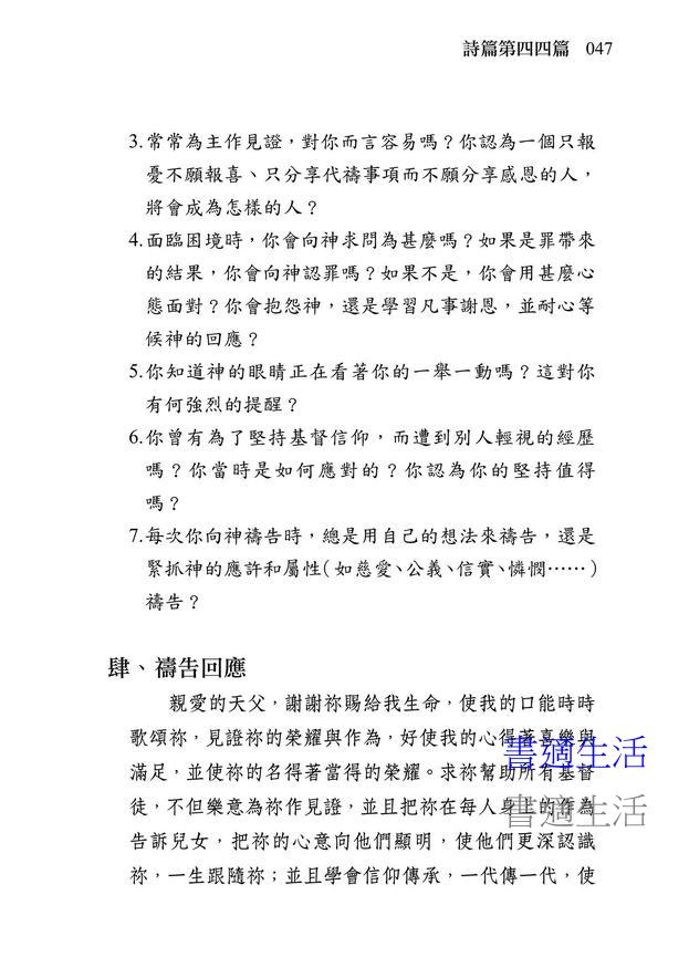 4 禱告回應:期待你能使用這個部分,真心向神禱告(邊看邊讀)。雖然這些是作者自己的感動,你若以為美,只要真心誠意地禱告,神必然垂聽。